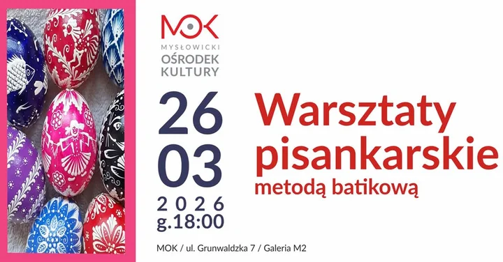 W Mysłowicach szykuje się coś bardzo świątecznego i naprawdę klimatycznego Podczas warsztatów pisankarskich metodą batikową będzie można poznać jedną z najstarszych technik zdobienia jajek i samodzielnie przygotować własne, niepowtarzalne pisanki. To fajny pomysł na spokojny, kreatywny wieczór przed Wielkanocą — zwłaszcza jeśli chcesz spróbować czegoś tradycyjnego i ręcznie wykonanego.